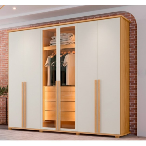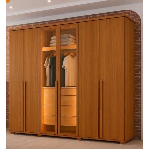 | MATERIAL | Este guarda-roupa combina elegância e funcionalidade com materiais de alta qualidade. As portas em vidro reflecta trazem um toque sofisticado, enquanto os cabideiros em alumínio garantem resistência. As gavetas com corrediças telescópicas oferecem abertura total e suave, e a iluminação em LED quente valoriza o interior. A estrutura interna, com nichos e maleiros amplos, proporciona organização prática e eficiente. |
