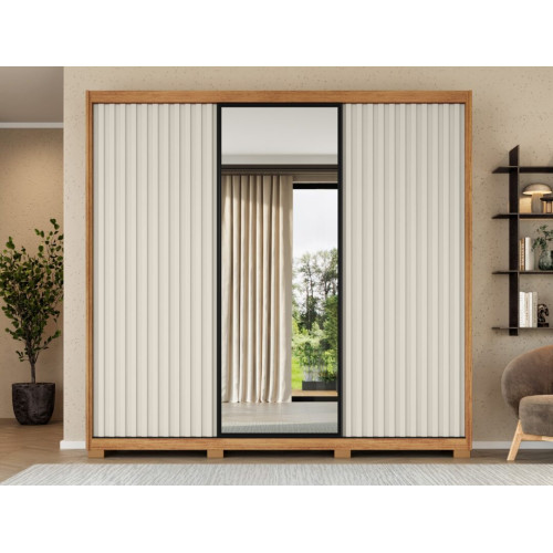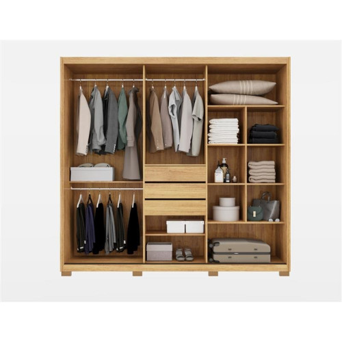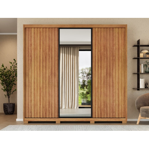 MATERIALEstrutura do produto: MDF e MDP 12 e 15mm, 3 portas deslizantes, sendo uma porta com acabamento em espelho e molduras em alumínio, e duas portas ripadas em MDF; 3 gavetas internas com corrediças telescópicas; 3 Cabideiros em Alumínio; trilho inferior em alumínio; trilho superior em PVC; Roldanas com sistema de amortecedores; 8 Pés em PVC; Amplo espaço interno com prateleiras e um nicho em colmeia para melhor divisão e organização.