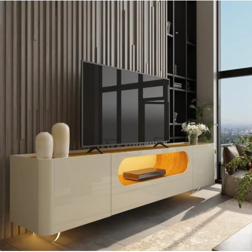 | MATERIAL | Portas com dobradiças "Slow Motion", Gavetas com corrediças telescópicas Tampa e nicho na cor Naturale, Rack de design curvo, LED em cor quente, Pés de madeira maciça |
